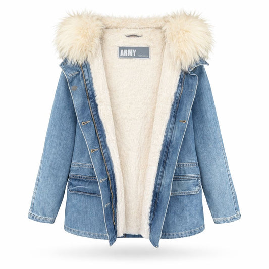YVES SALOMON - PARKA IN DENIM LIGHT BLUE WITH ORILAG FUR LINING AND HOOD