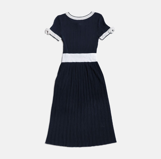 CHANEL - DRESS LONG NAVY AND WHITE RIBBED PLEATED KNIT SIZE 38 FR