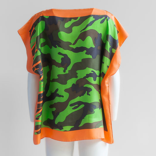 VALENTINO - TOP SILK CAMOUFLAGE GREEN PRINT AND ORANGE TRIM