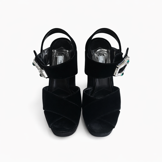 PRADA - SANDALS BLACK VELVET WITH JEWEL BUCKLE SIZE 37,5 EU