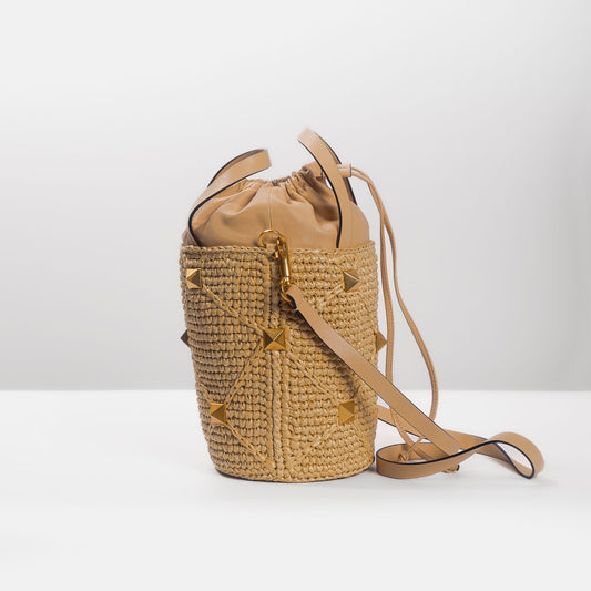 VALENTINO - BAG BUCKET ROMAN STUD IN RAFFIA AND LEATHER