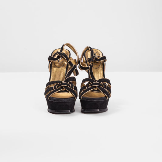 SAINT LAURENT - SANDALS TRIBUTE BLACK SUEDE WITH GOLD TRIM SIZE 37,5 EU