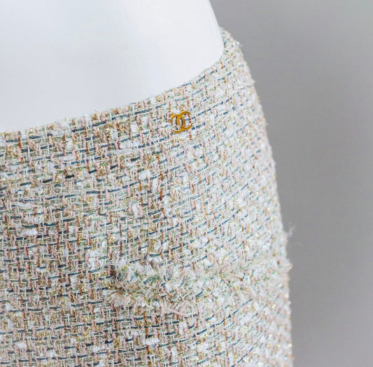 CHANEL - SKIRT TWEED BEIGE PINK LIGHT BLUE AND GOLD TONES SIZE 40 FR