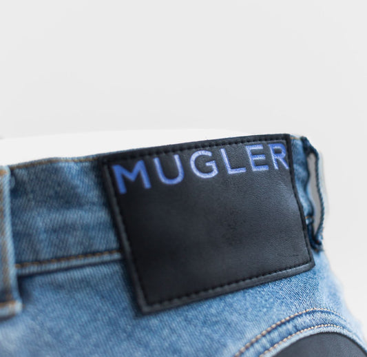 MUGLER - JEANS DENIM LIGHT BLUE BLACK DETAILS SIZE 38 FR