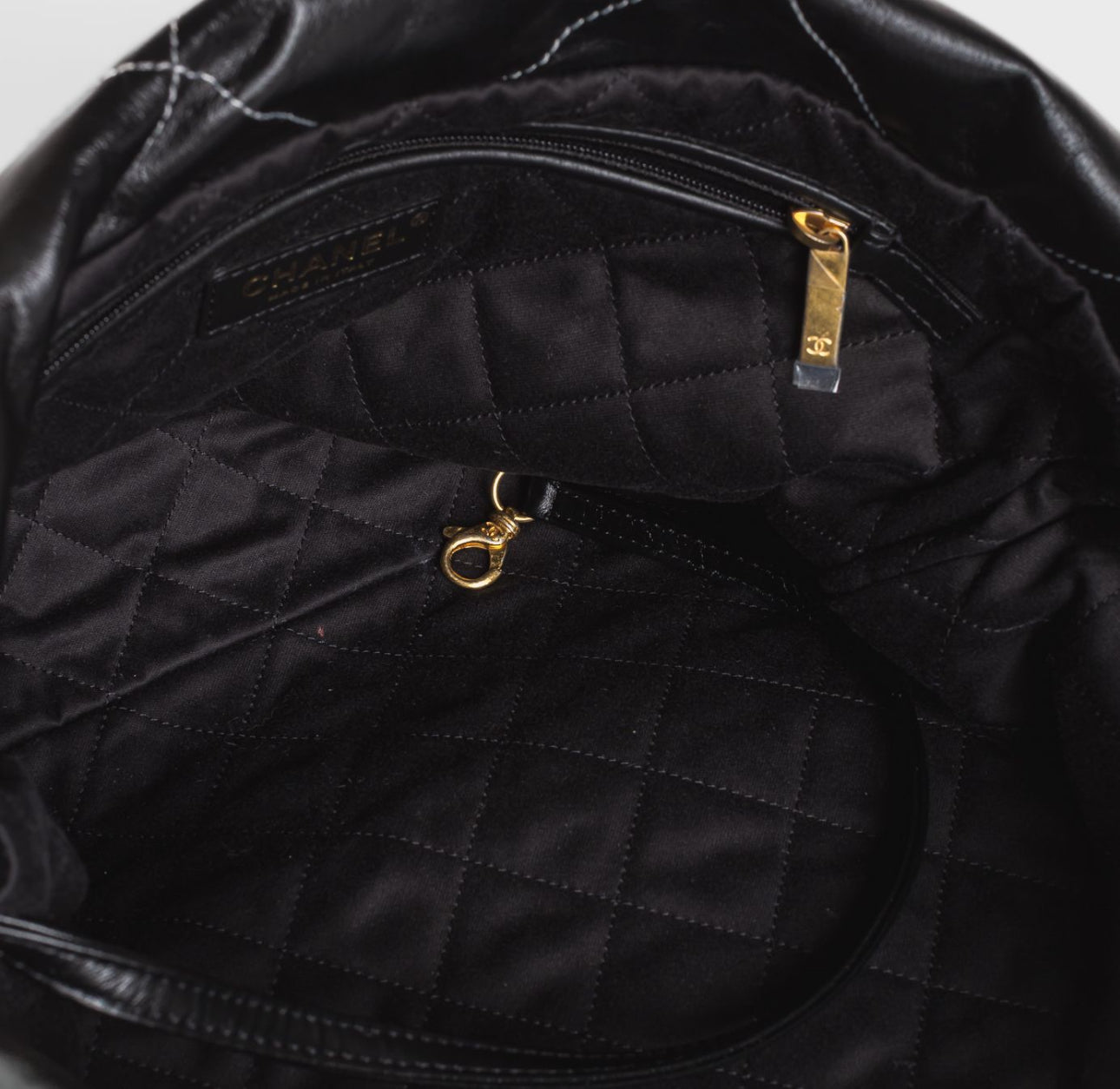 Modern and iconic, the Chanel 22 Small Bag is crafted from shiny black leather and finished with brushed gold-tone metal hardware. The design is elevated with bold white contrast stitching, a spacious silhouette, and the classic Chanel signature on the front. It also comes with a detachable black pouch inside, adding both practicality and elegance.