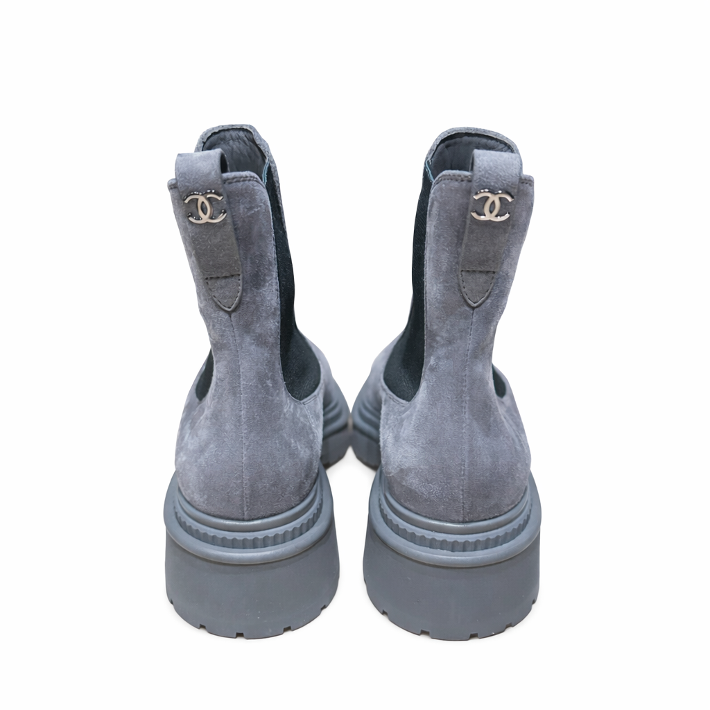 Elegant and contemporary, these Chanel Interlocking ankle boots are crafted from refined suede with a contrasting leather toe and a rubber sole for comfort and durability. Finished with the iconic CC logo on the back tongue, they come in a beautiful grey shade with subtle lilac undertones, making them both versatile and distinctive.