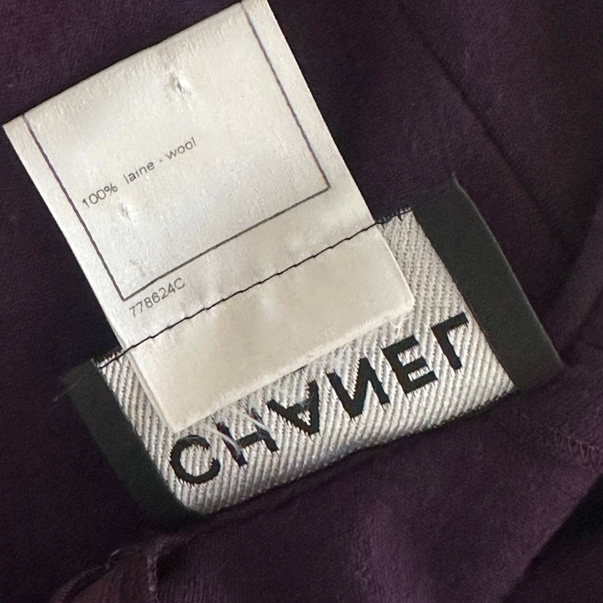 Elegant Chanel dress from the 2007 collection in a rich purple hue, featuring long sleeves and a midi length. Paired with a matching patent belt, perfect for a sophisticated silhouette.