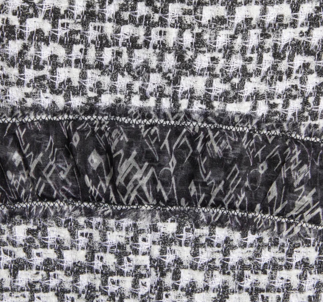 Sophisticated Chanel midi dress from the 2013 collection, crafted in a white, grey, and black tweed. Features ruffled curved appliqués in grey and black, fringe trims, round neckline, short sleeves, shoulder pads, and discreet side seam pockets. The A-line skirt is finished with a back zip closure. Fully lined in silk satin with a tonal grey camellia motif.
