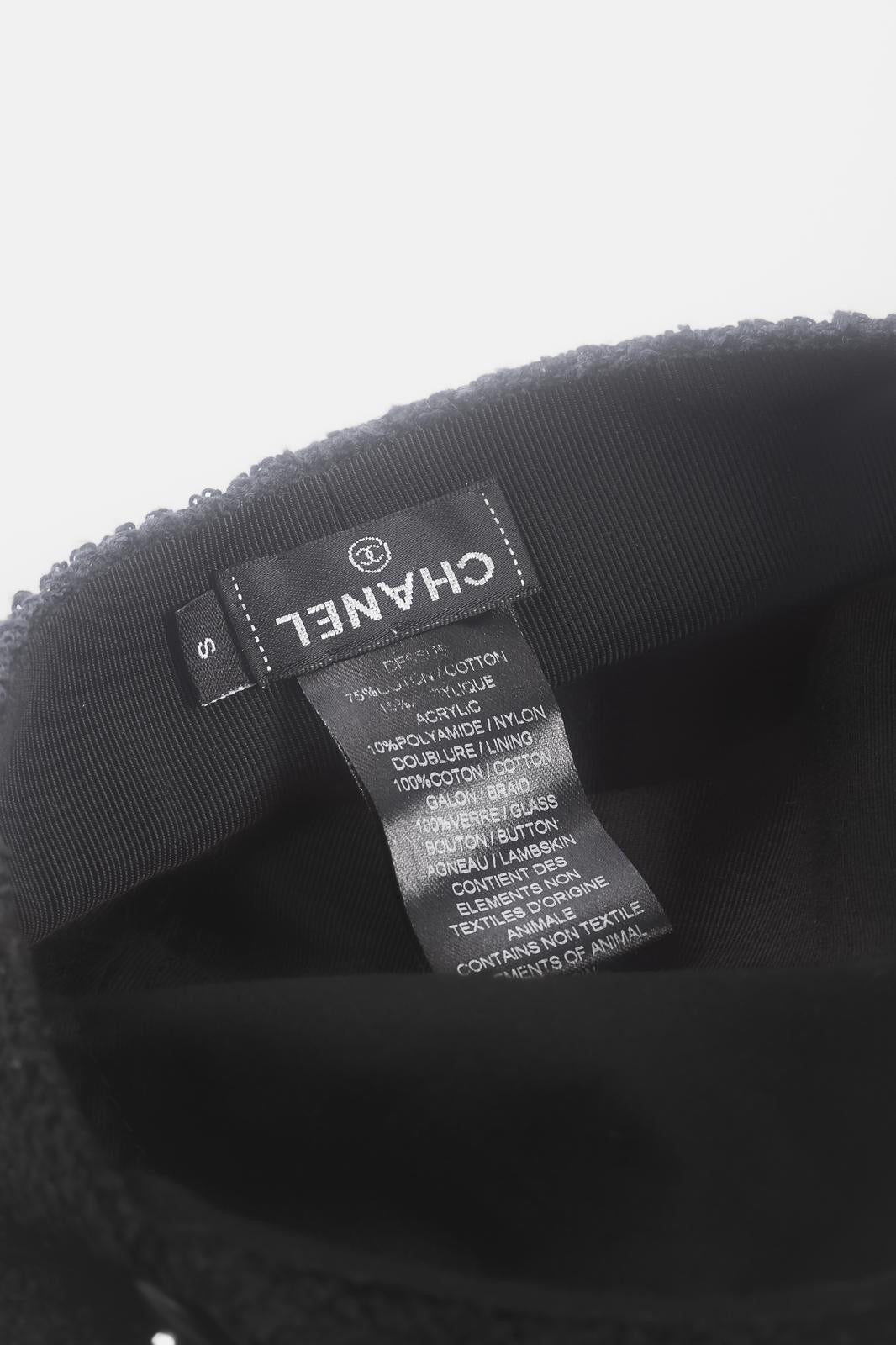 Chic Chanel cap crafted in blue tweed, adorned with delicate white pearls for a refined, feminine touch.