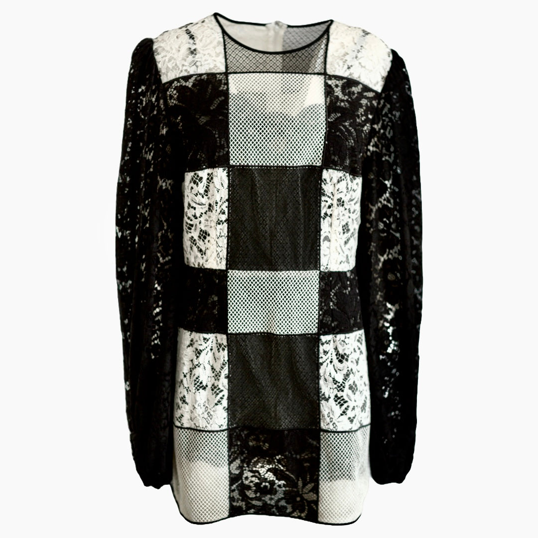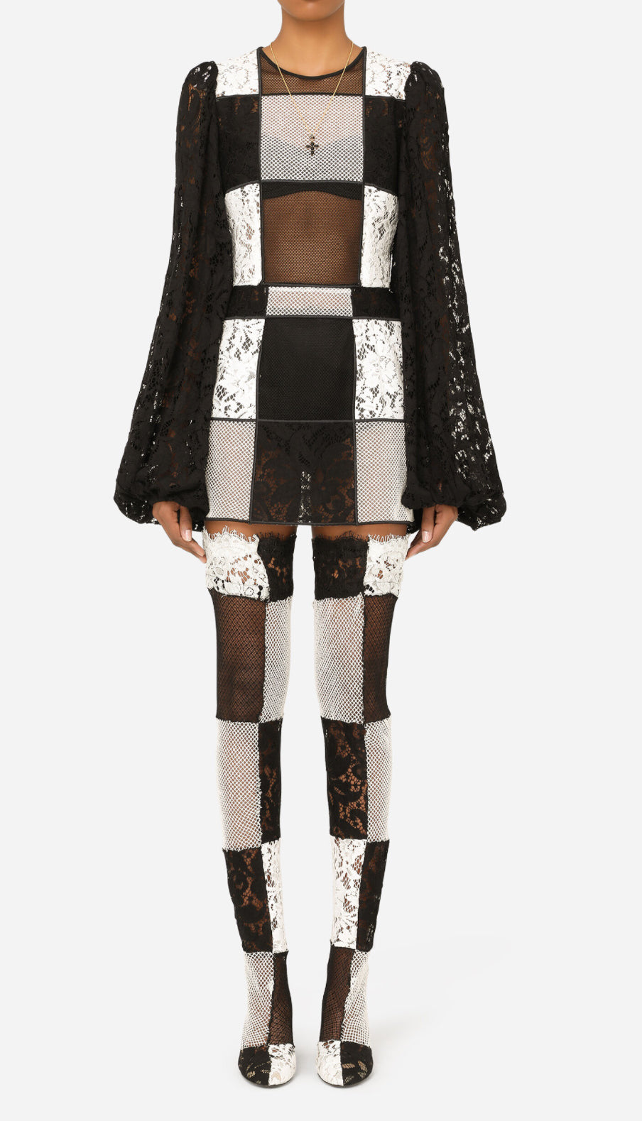 DOLCE & GABBANA – Short Patchwork Lace Dress Black & White Size 48 IT
