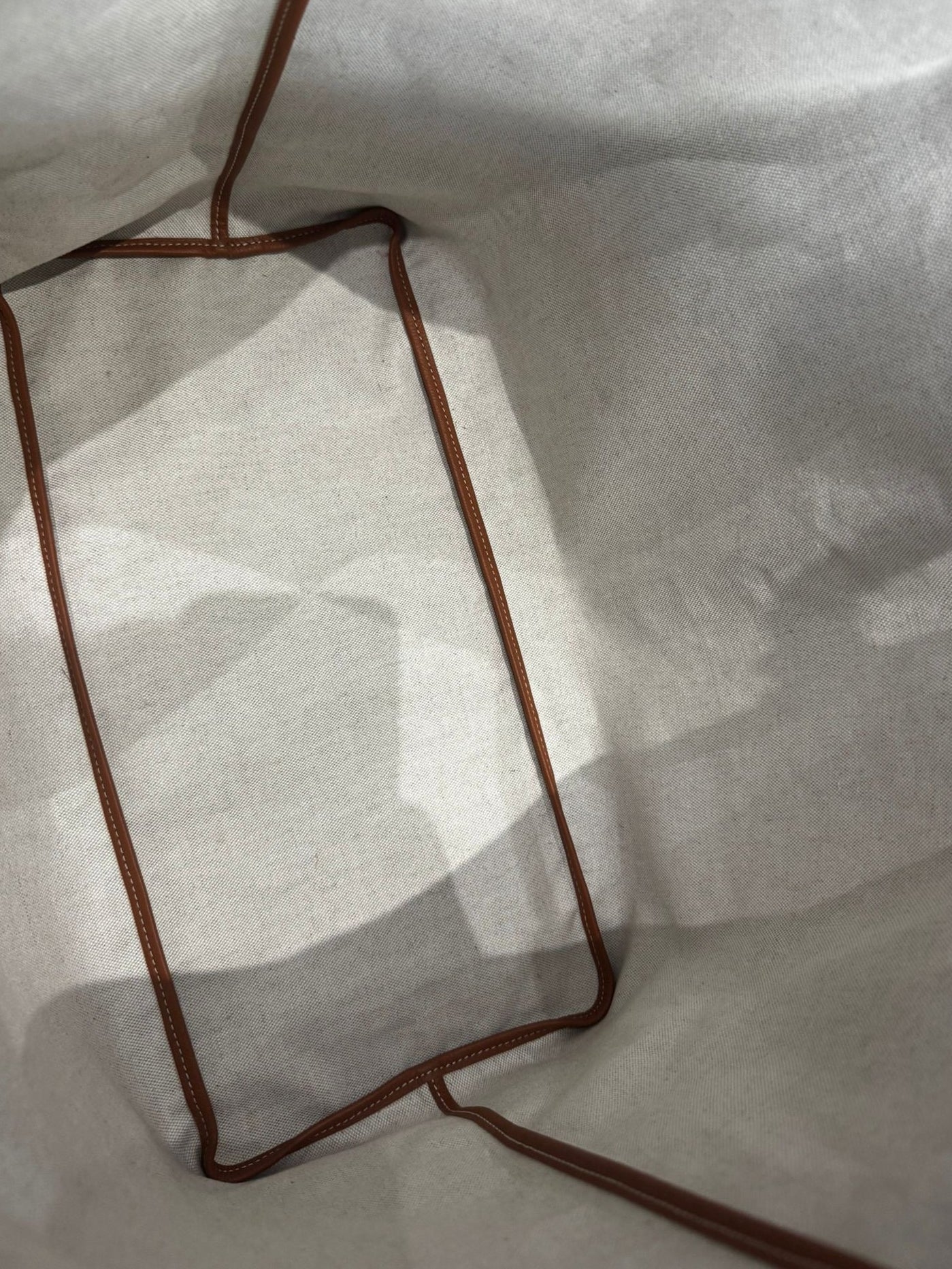 Crafted in Goyard’s signature coated canvas, the bag is finished with elegant brown (camel-tone) leather trim and features a canvas lining, combining practicality with timeless sophistication. The GM size offers generous space, making it ideal for daily use or travel.