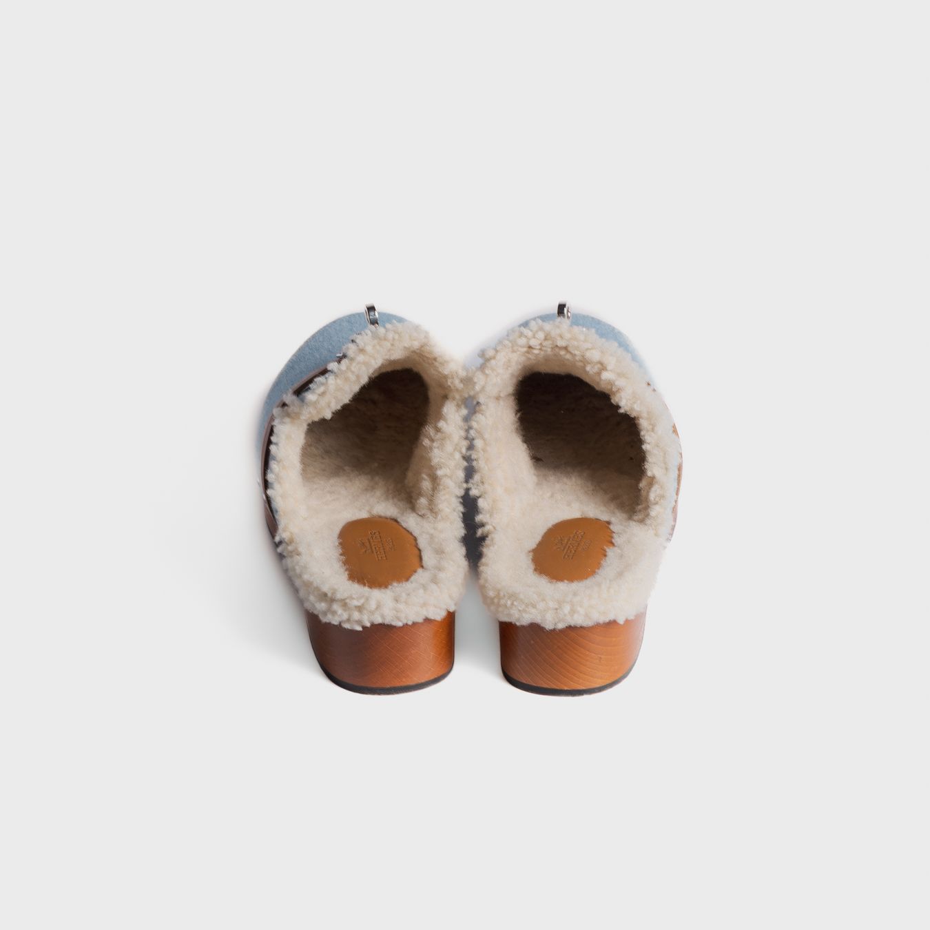 Elegant Hermès Kelly Buckle sabot sandals in denim blue with Gold leather and white mouton lining, featuring silver-tone hardware. Protective films remain on the hardware; the sole shows minimal wear at the tip.