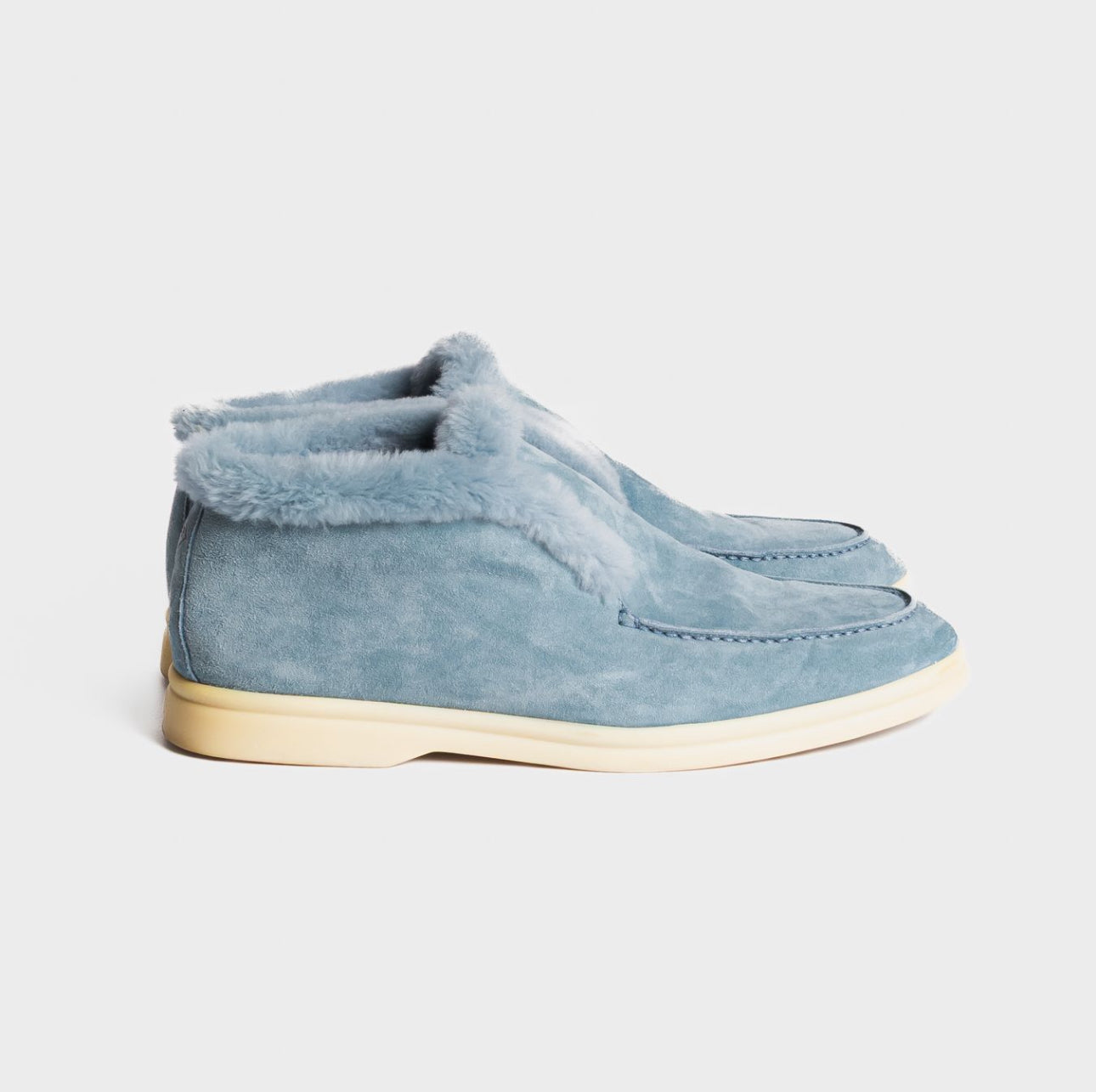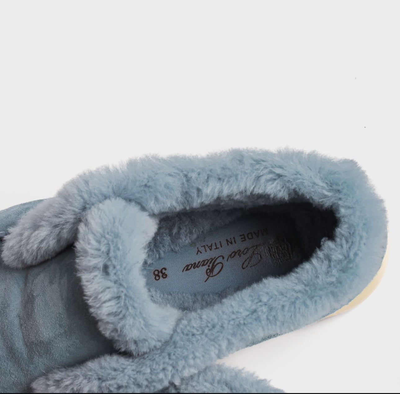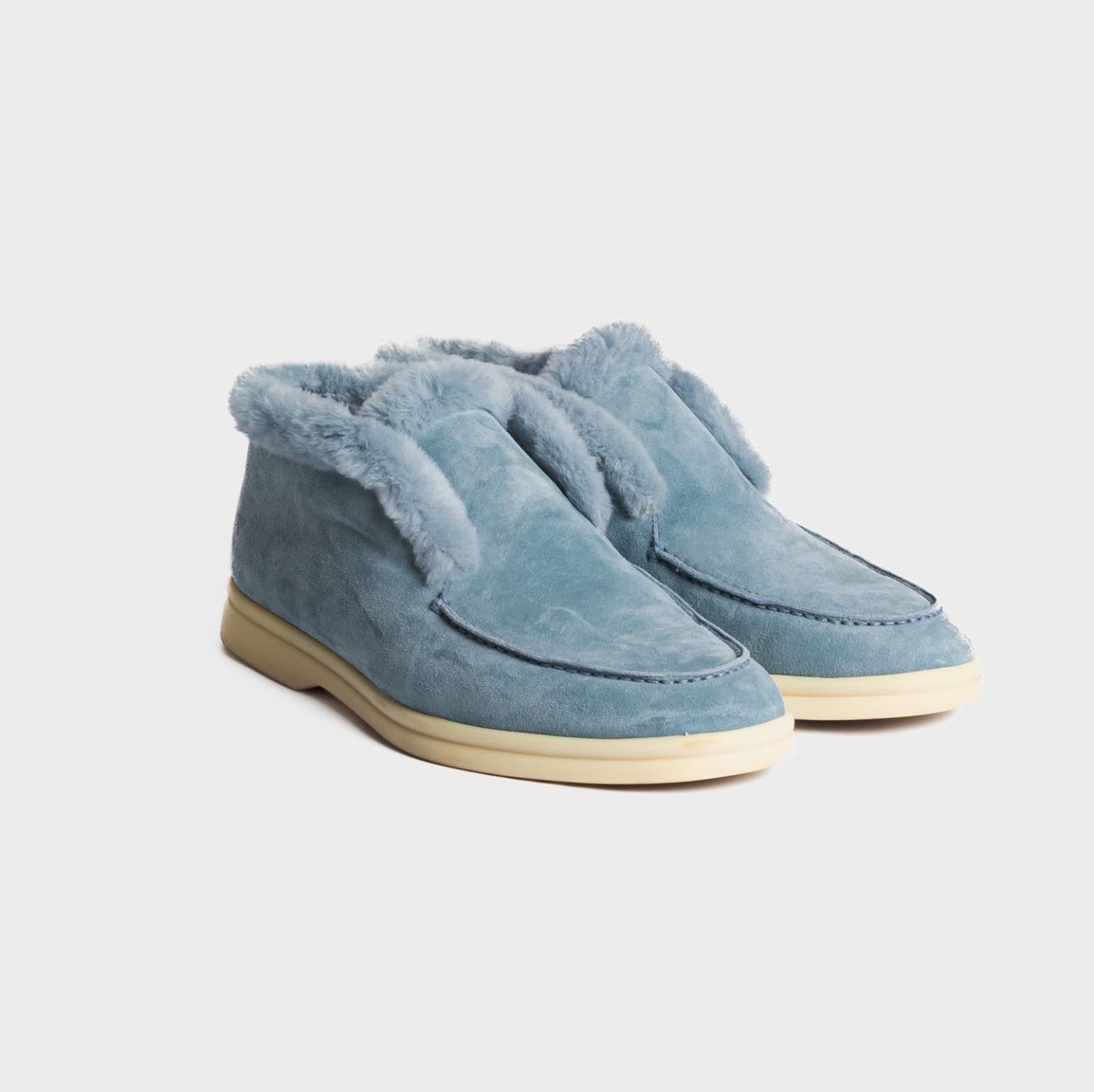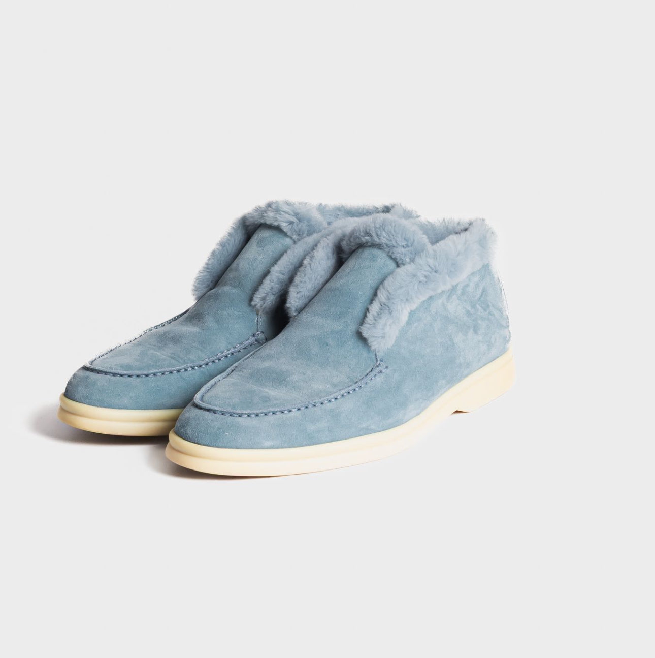 Elegant and cozy Loro Piana ankle boots in soft celeste suede. Inspired by the brand’s classic men’s styles, they feature a patented elastic opening hidden under the tongue and are fully lined in luxurious beaver fur for warmth and comfort. Perfect both for city wear and for the coldest mountain days.