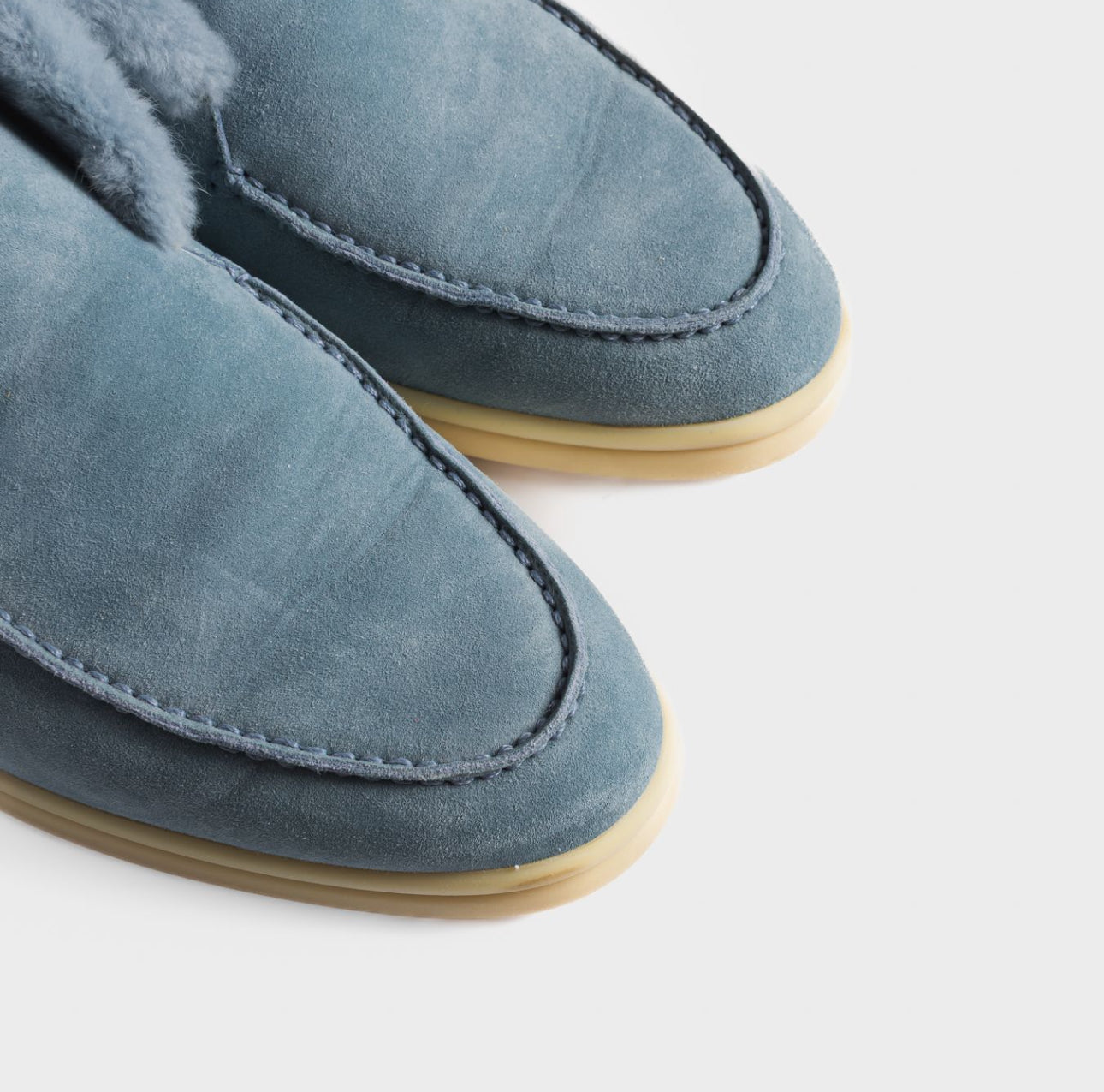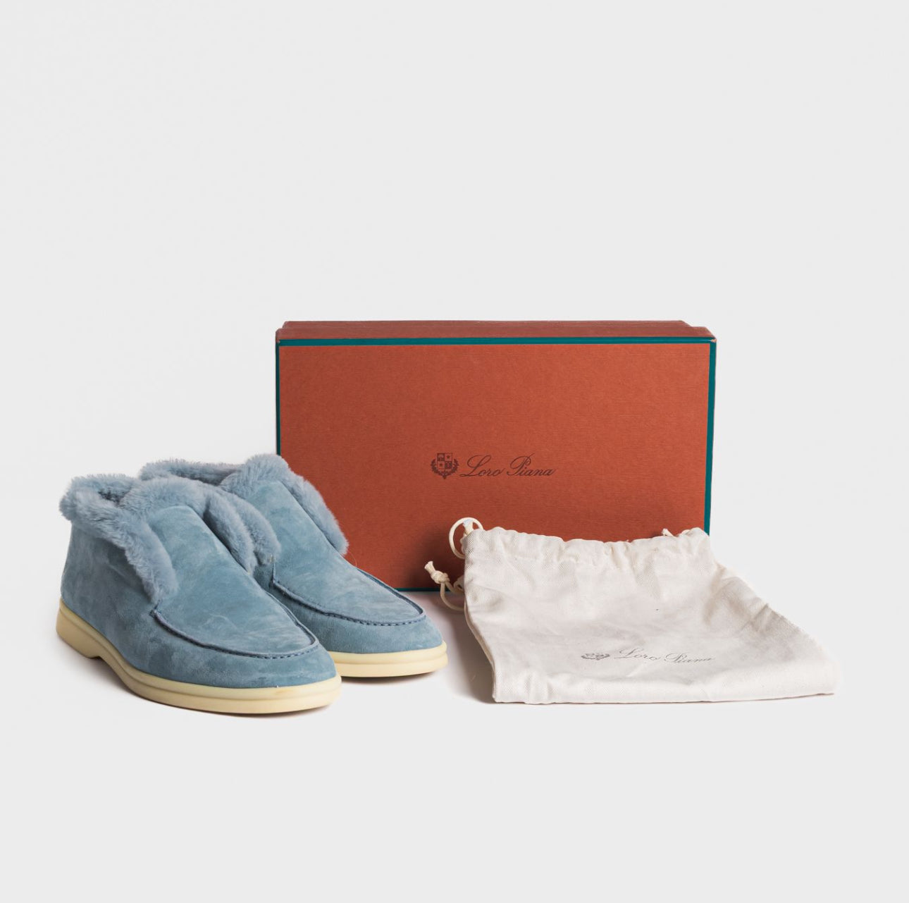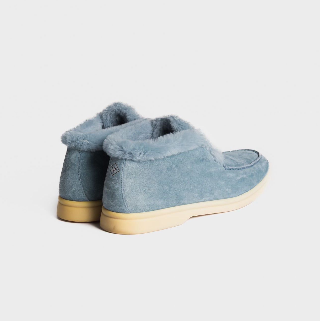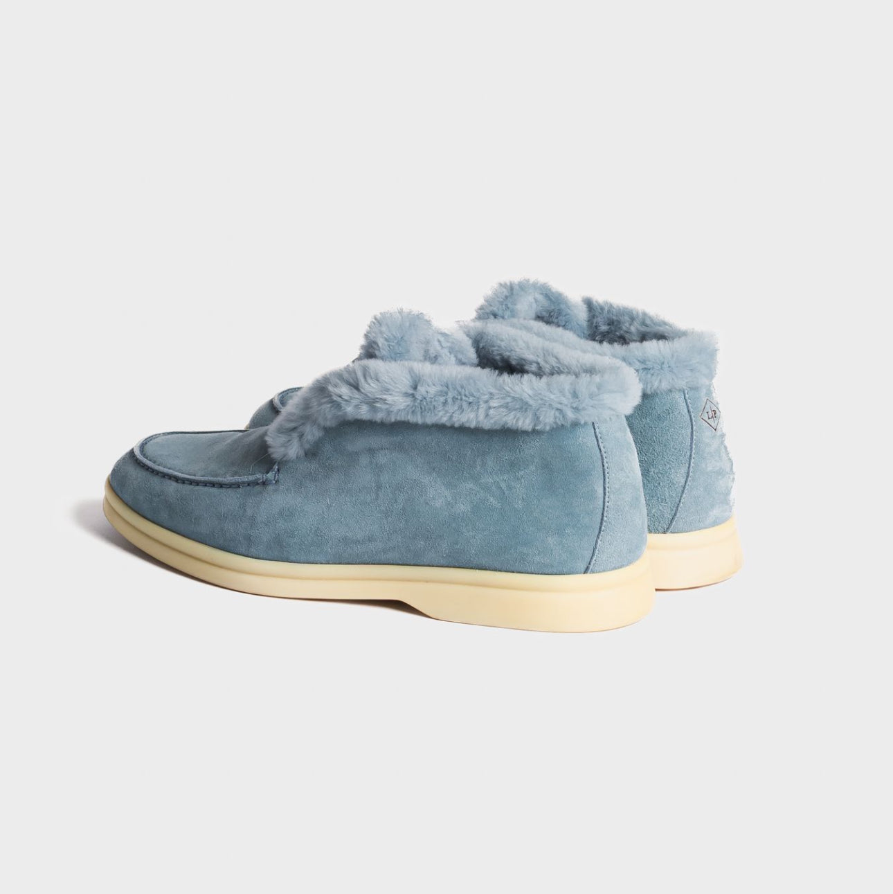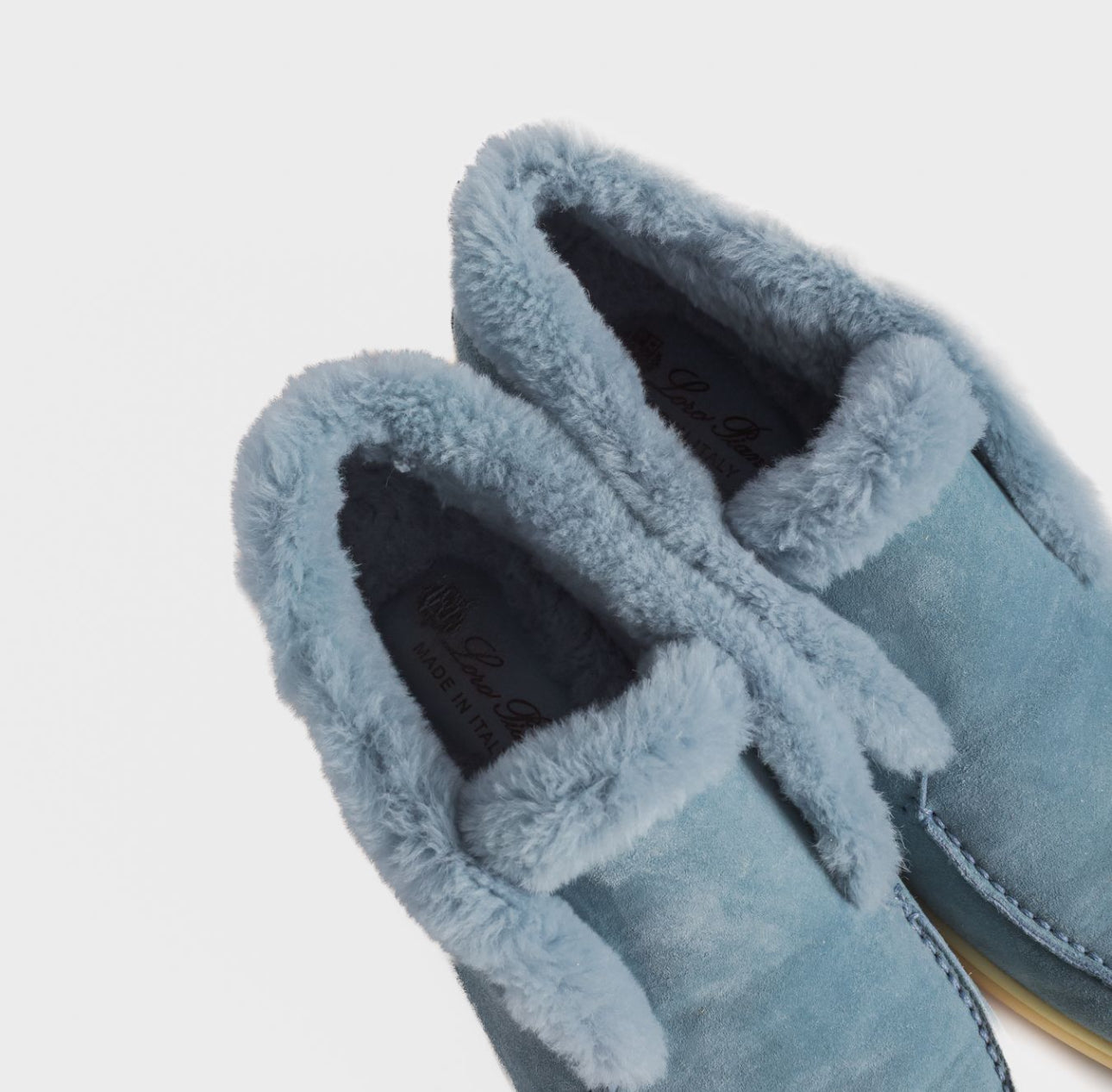 Elegant and cozy Loro Piana ankle boots in soft celeste suede. Inspired by the brand’s classic men’s styles, they feature a patented elastic opening hidden under the tongue and are fully lined in luxurious beaver fur for warmth and comfort. Perfect both for city wear and for the coldest mountain days.