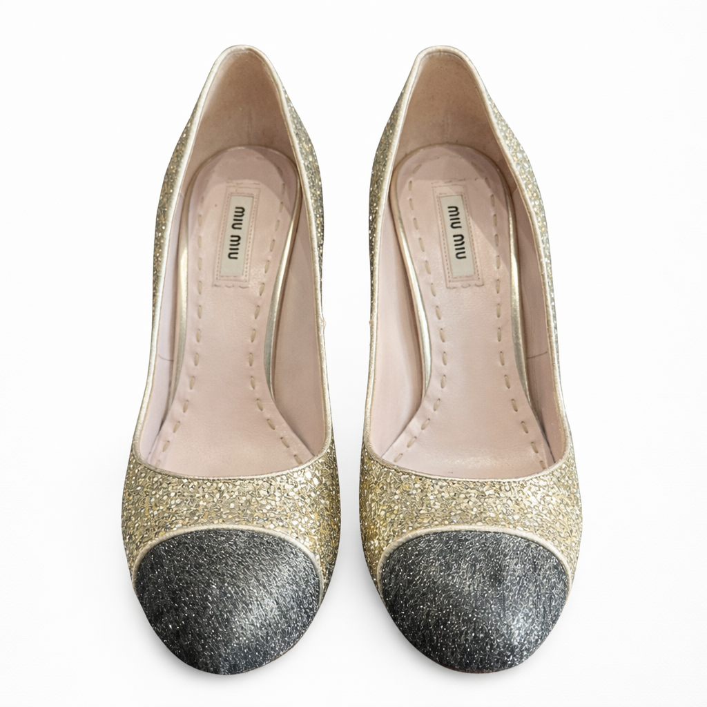 MIU MIU – Gold Glitter & Black Leather Platform Pumps