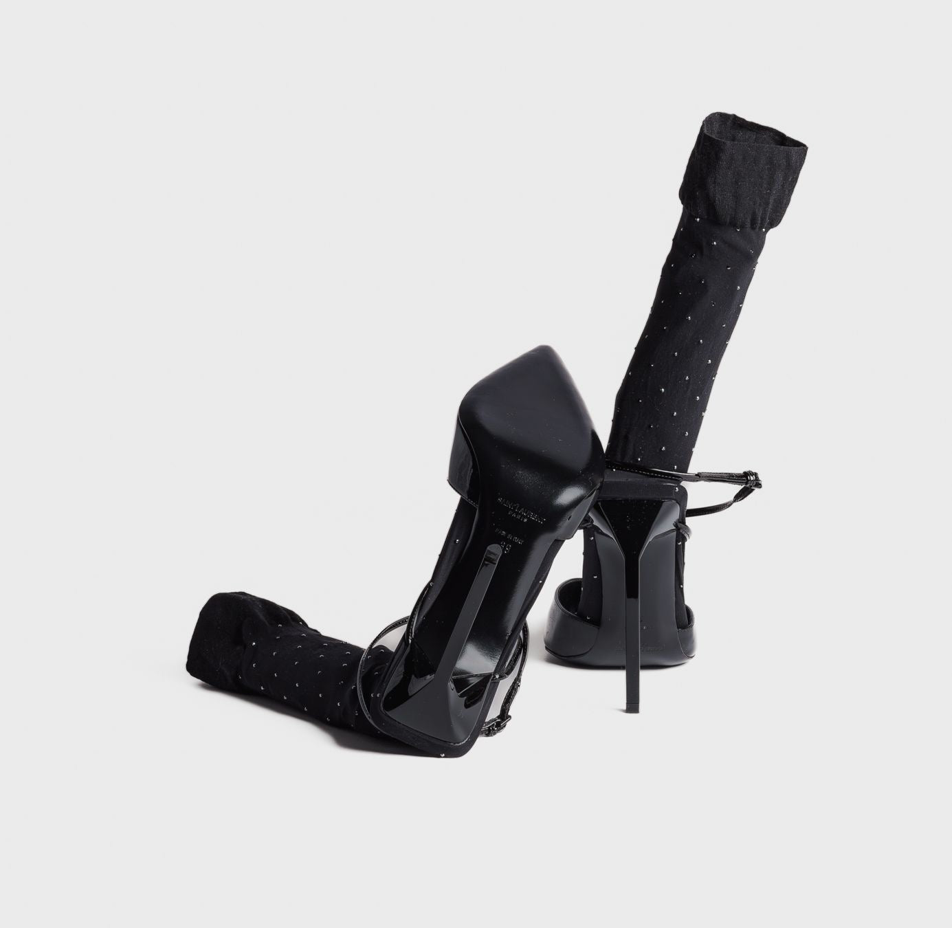 Elegant Saint Laurent pumps in black, featuring patent leather and a sock-style upper embellished with small sequins. Heel height 11.5 cm.